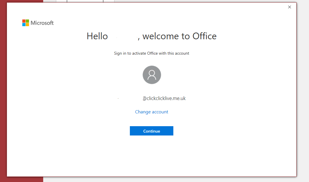 Open one of the applications and you will be asked to sign in using the same credentials you logged into the web portal with. Select Continue when ready.