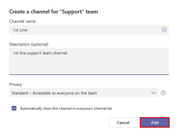 Type in the name of the individual or group you want to add to the channel and select Add.