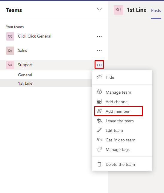 As well as create a company wide channel where everyone on your Microsoft 365 domain will be added and able participate, you may have teams created specifically for a department where you would want only members of that department involved. To add members to a Team, select the ... icon next to the Team you would like to add the new member for and select Add member.