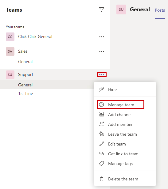 To remove a team member from a channel, Select the ... icon next to the team you would like to remove the Team member from and select Manage Team.
