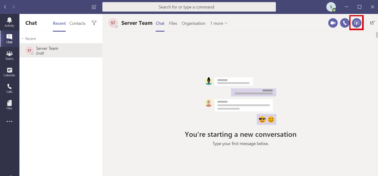 Start a chat with the user you wish to screenshare with and then select the screenshare button. Screensharing is currently only available on the desktop applicaton