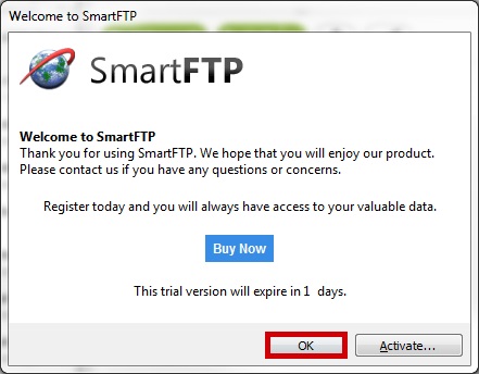 As this is a Trial Version, each time you launch Smart FTP you will be presented with the Activation prompt until you purchase a licence, click OK to continue with the trial version.