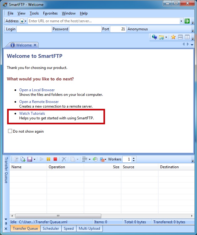 Close the Welcome Screen, you may wish to read Smart FTP Tutorials