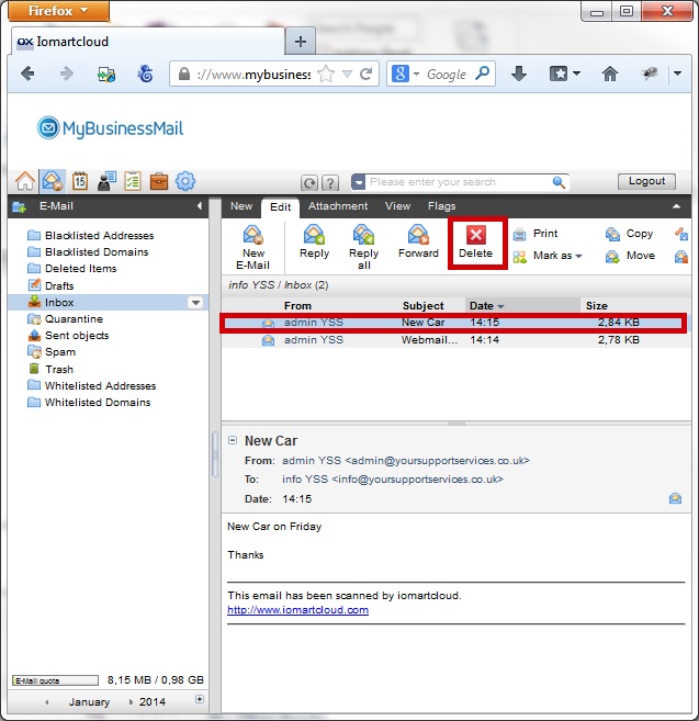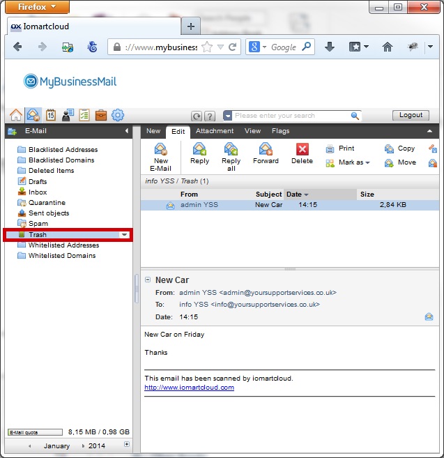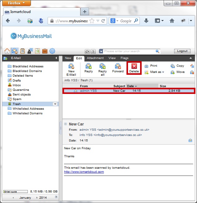 To completely remove emails from the server, select the mail you wish to delete from the "Trash" folder and click "Delete"