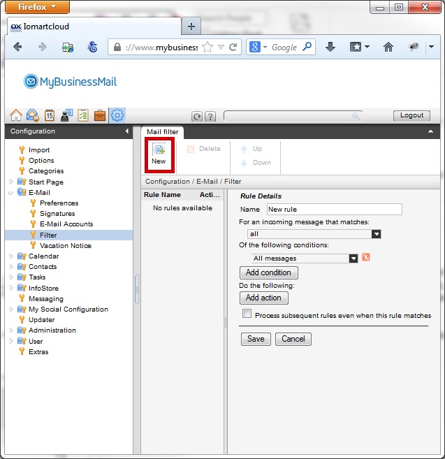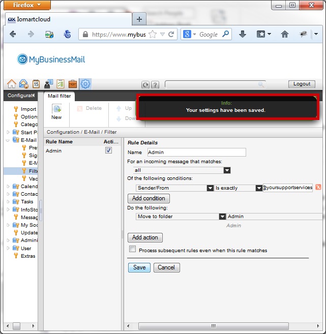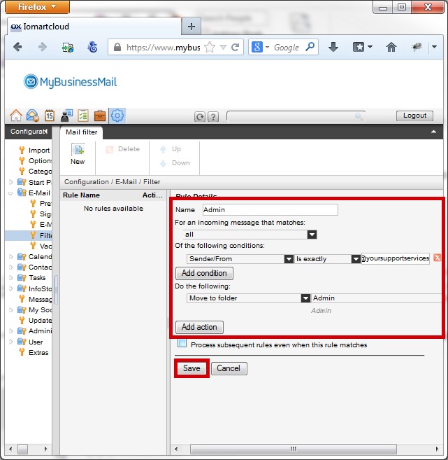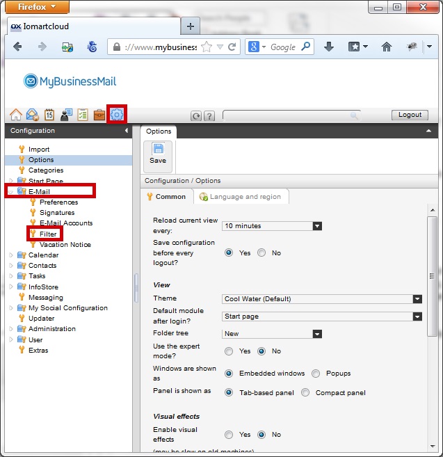 Select the "Configuration" Icon, Select the email Folder and "Filter"