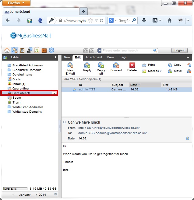 If you select the "Sent Objects" folder you can view all "Sent Mail"