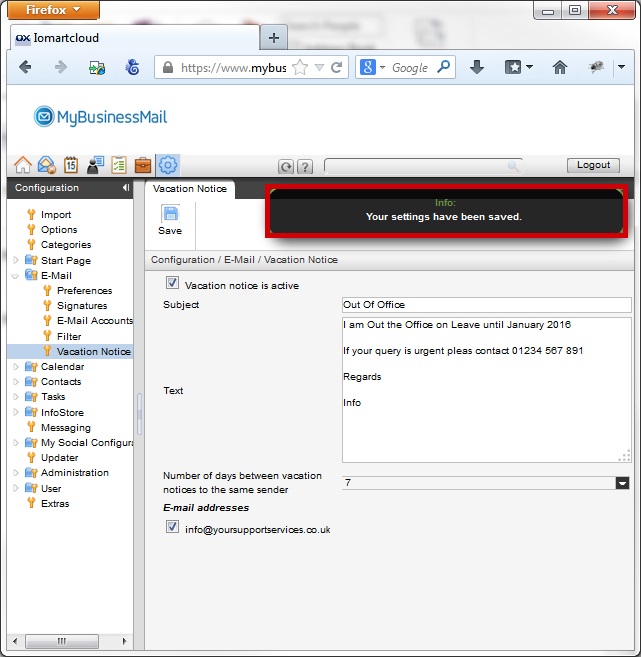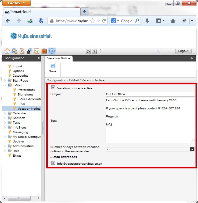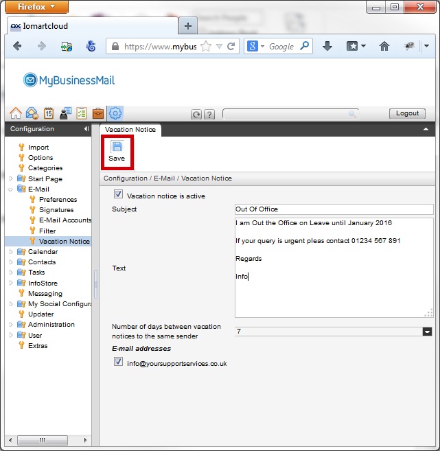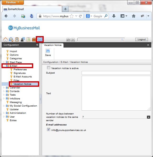 Select the "Configuration" Icon, Select the email Folder and "Vacation Notice"