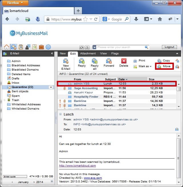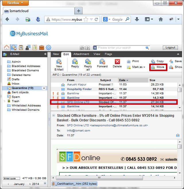 Select the email from the domain you wish to "Blacklist list" and select "Move"