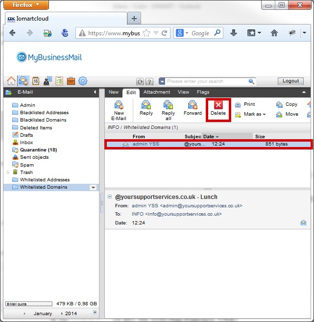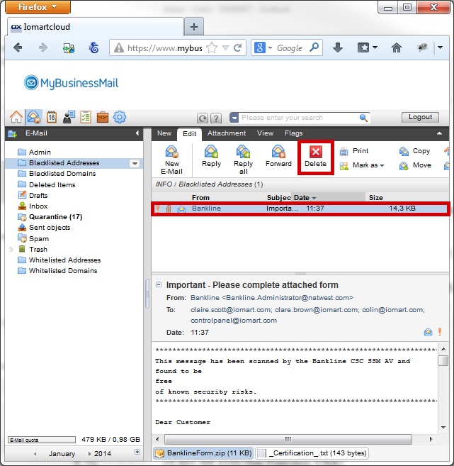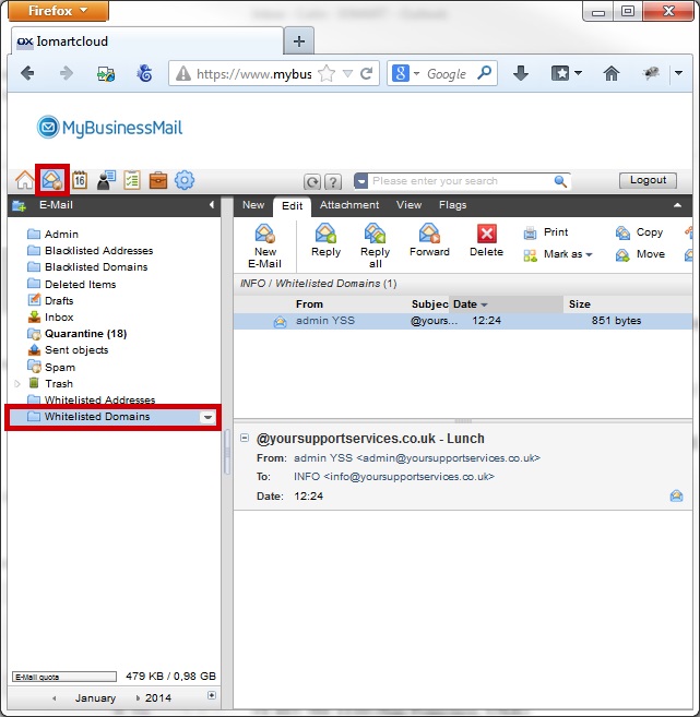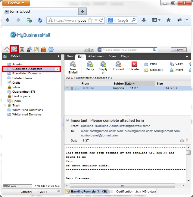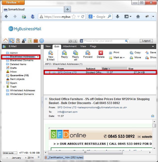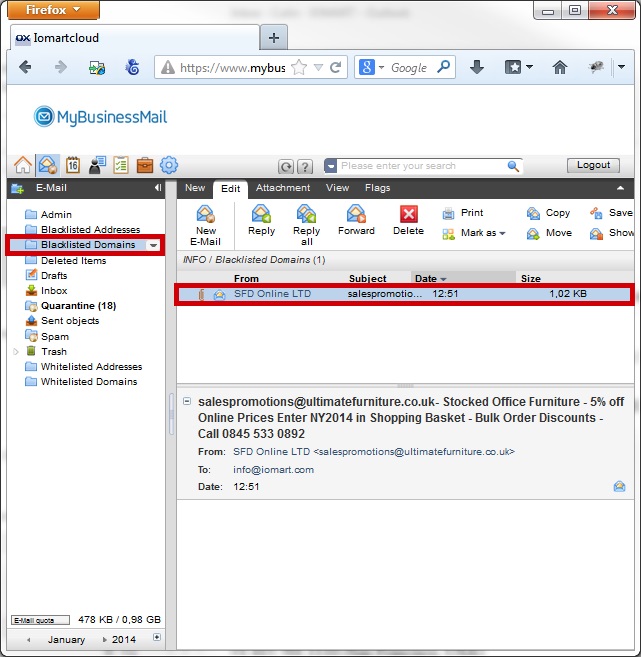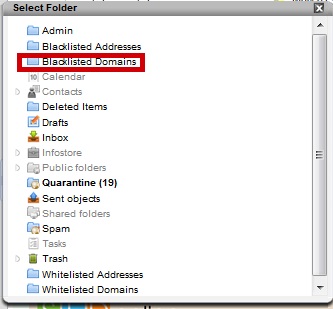 Select the "Blacklisted Domains" folder and you will see the selected email
