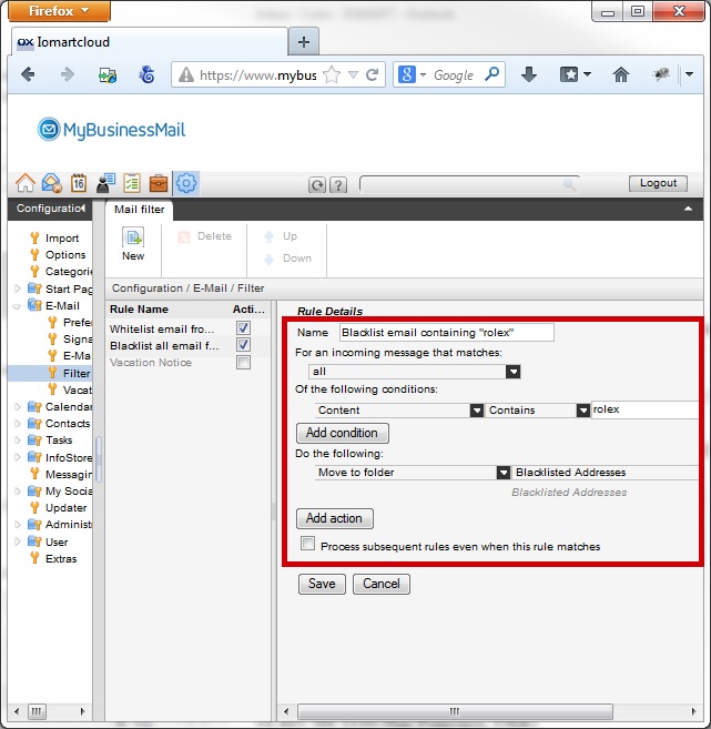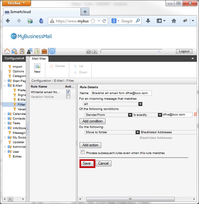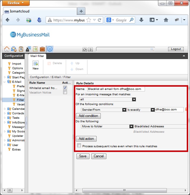 | Of the following conditions : | Sender From | Is exactly | enter email address to be blacklisted |