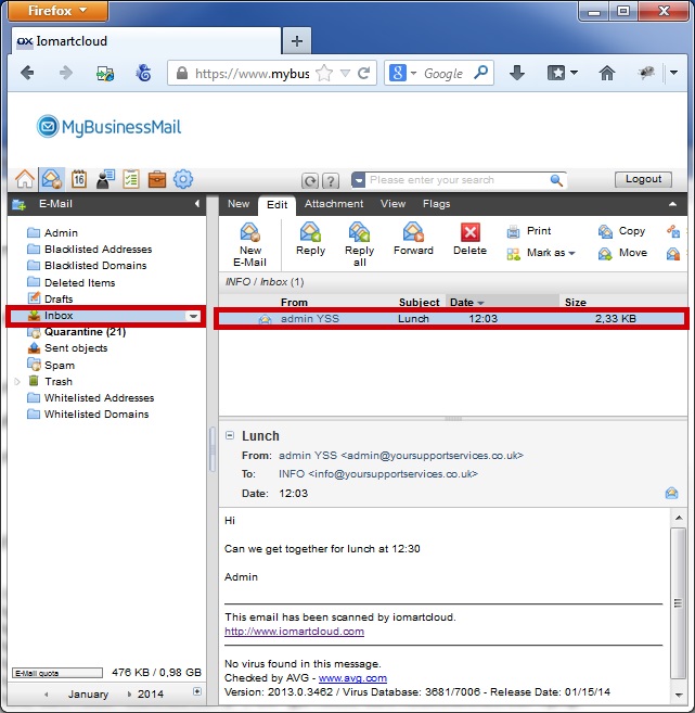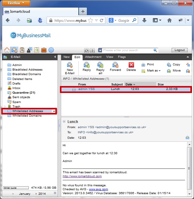 After 60s Business Mail will whitelist the address and the email you "whitelisted" will display in your inbox