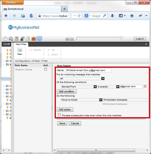 | Of the following conditions : | Sender From | Is exactly | enter email address to be whitelisted |