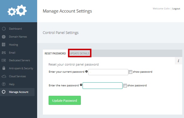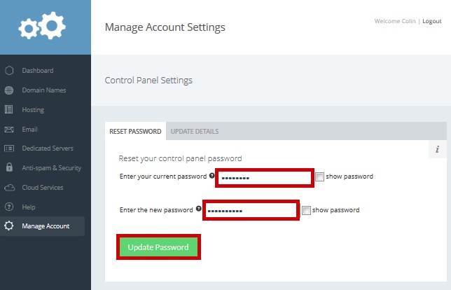 You can reset your control panel password by entering your current password and your new password and clicking "Update Password"