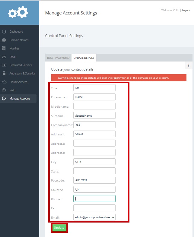 Update any relevant details and click "Update" (NOTE - your domain owner details will also be updated)